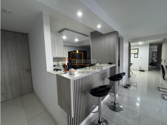 El apartamento consta de sala, comedor, cocina tipo americano, balcón vista interna, ventanales dobles que proporcionan una excelente iluminación, sala de Tv, estudio con mueble, baño social, baño de alcobas, dos habitaciones, principal con baño privado, aire acondicionado, vestier y balcón.