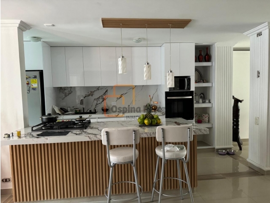 La casa consta de dos niveles. Primer nivel: garaje interno para cuatro vehículos, sala, comedor, cocina integral con lámparas de techo, barra y horno, sala de Tv, baño social, patio interno con piscina privada, zona de oficios. Segundo nivel: cinco habitaciones con closets, dos con baño privado, estudio, baño de alcobas.